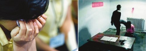 한 탈북인이 북한의 여성 인권을 고발하며 울고 있다(왼쪽). 북한 국가안전보위부 취조실에서 보위부원이 북송된 탈북 여성을 발로 걷어차는 모습.