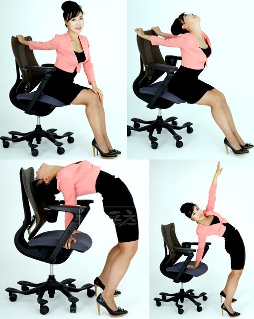 1. 의자에 앉아서 상체를 앞으로 내밀며 팔을 뒤로 해서 의자등받이를 잡는다. 5초 정지 좌우교대 3회 반복.