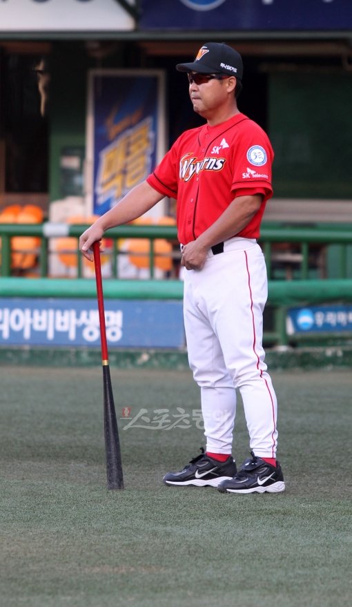 6일 서울 목동구장에서 열린 프로야구 SK 와이번스와 넥센 히어로즈의 경기 전에 SK 이만수 감독대행이 그라운드에서 연습하는 선수들을 바라보고 있다.