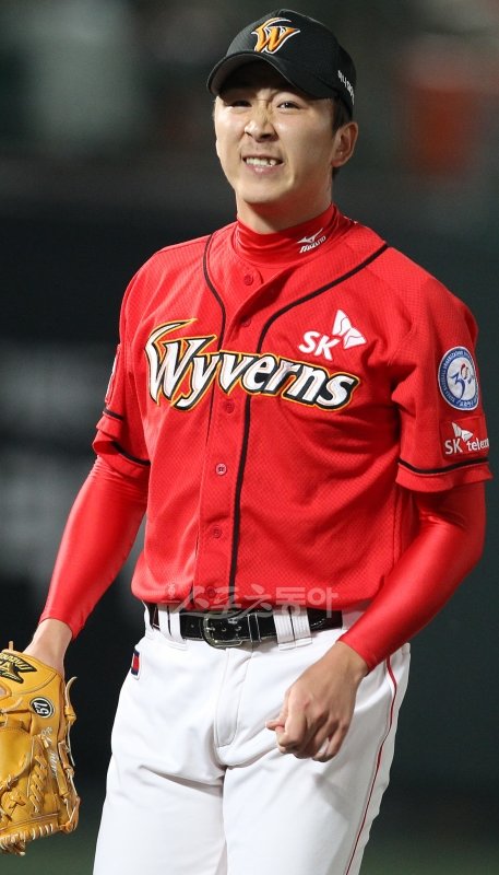 7일 서울 목동야구장에서 열린 프로야구 SK 와이번스와 넥센 히어로즈의 경기에서 8회말 넥센 공격, 2사 2,3루 SK 정우람이 넥센 알드리지를 삼진아웃시킨 후 덕아웃으로 향하고 있다.
