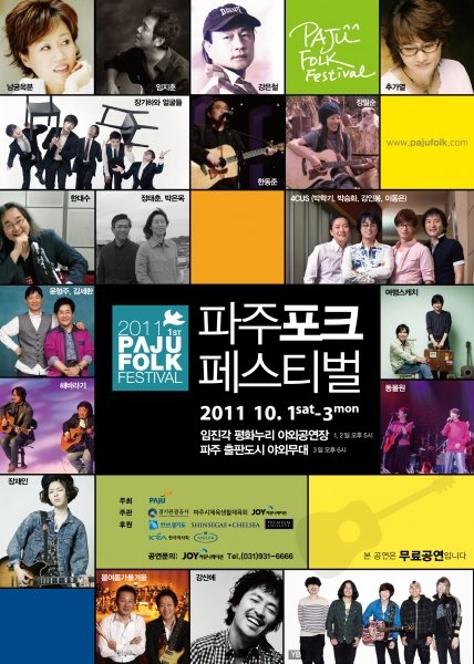 파주시가 주최하고 경기관광공사와 죠이커뮤니케이션이 주관하는 제1회 ‘파주포크페스티벌’이 10월 1일부터 사흘간 경기도 파주 임진각 평화누리 야외공연장(1·2일)과 파주 출판도시 야외무대(3일)에서 열린다.