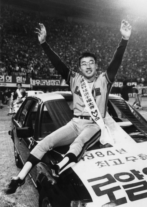 1984년은 ‘불멸의 에이스’ 최동원의 절정기였다. 최동원이 1984년 페넌트레이스 최우수선수(MVP)에 선정된 후 부상으로 받은 자동차 위에서 포즈를 취하고 있다. 스포츠동아 DB