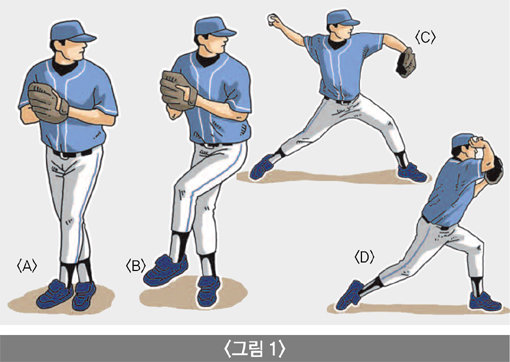 <그림 1-B> 몸이 앞쪽에 있는 타깃을 향해 있고, 운동량이 생겼을 때 뒤쪽 어깨를 향해 앞쪽 무릎을 들어 올린다. 이때 무릎 높이는 일반적인 투구법 정도로 올린다.