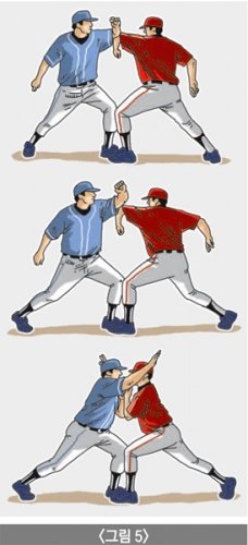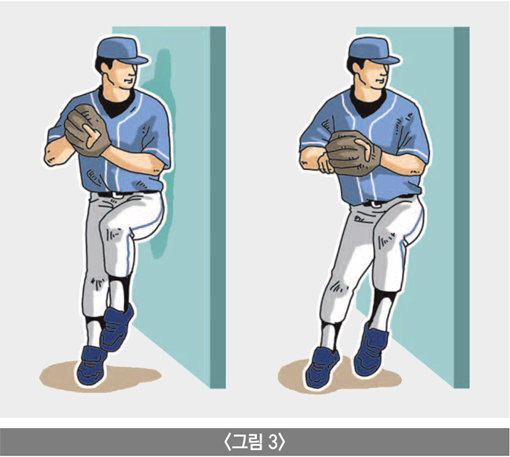 훈련법=<그림 3>이는 앞쪽 엉덩이로 리딩하는 타이밍과 느낌을 배우기 위함이다. 이것은 앞쪽 다리를 최적의 스트라이드 길이를 만들 높이까지 끌어올리는 동안 운동량을 생산해낼 수 있도록 도와준다. 보통 10회에서 15회 정도 반복이 필요하고, 벽이나 펜스 또는 거울로부터 6∼8인치 정도 떨어져서 앞쪽 발 옆면이나 몸의 앞쪽 부분을 벽,펜스, 거울과 평행하게 만든 뒤 스탠다드 자세를 취하게 된다. 등뼈나 머리자세를 바꾸지 않은 채로, 앞쪽 엉덩이를 앞으로 리드해야 한다. 그리고 동시에 앞쪽 다리를 들어 올리고 벽을 향해 앞으로 움직이면서 전신의 운동량을 얻는다. 글러브에서 손을 빼기 시작하고, 엉덩이 앞 부분을 벽, 펜스 혹은 거울에 대고 ‘친다’. 이 자세를 3∼5초 가량 유지하고, 이 동작을 반복한다.