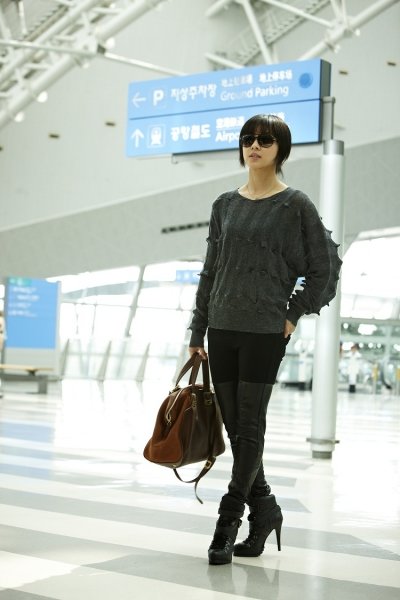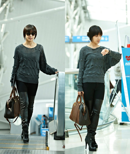 디테일이 살아있는 짙은 그레이 컬러의 니트 상의에 허벅지까지 가죽으로 된 레깅스를 착용하여 스타일을 한껏 살려주었으며, 공항패션의 필수품인 빅프레임 선글라스와 브라운 컬러의 빅백으로 가을 속 여인의 모습을 공개했다.