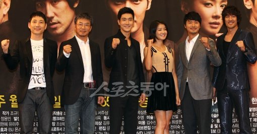 15일 오후 2시 서울 강남구 대치동 컨벤션 디아망에서 열린 KBS 월화드라마 ‘포세이돈’ 제작발표회에서 출연배우들이 포즈를 취하고 있다. ‘포세이돈’은 전미 시청률 1위이자 국내에도 두터운 팬 층을 갖고 있는 인기 미드 NCIS(해군 범죄 수사대)의 한국판 버전으로, 국내 최초로 ‘해양 경찰 미제 사건 수사대’의 리얼 스토리를 담은 수사극으로 19일 첫 방송된다. 정운택, 길용우, 최시원, 이시영, 이성재, 한정수(왼쪽부터).
