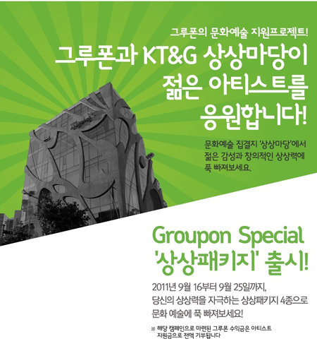 그루폰코리아는 25일까지 복합문화공간 KT&G 상상마당과의 제휴를 통한 스페셜 위크(사진)를 진행한다고 밝혔다. 콘서트와 아카데미 수강료 할인쿠폰 판매를 시작으로 KT&G 상상마당의 공연, 아카데미, 카페, 디자인샵 등에서 사용할 수 있는 다양한 쿠폰을 소개한다. 23일 공연 예정인 ‘메탈하니 콘서트’ 티켓은 현장 판매가격 3만5000원에서 57% 할인된 1만5000원에, 영화음악과 사진 등 다양한 강좌가 개설된 아카데미 수강권은 10% 할인된 가격에 제공한다.