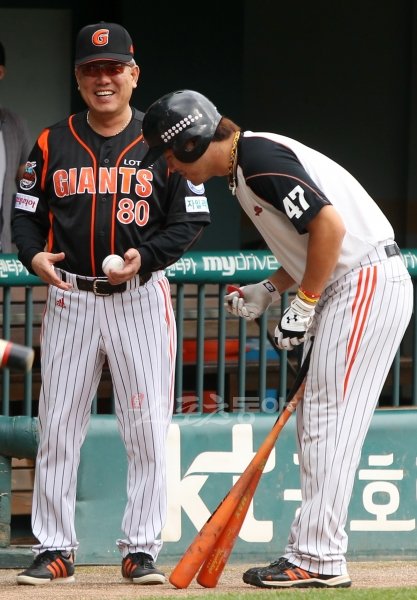 18일 서울 잠실야구장에서 열린 프로야구 롯데 자이언츠와 두산 베어스의 경기 전에 롯데 양승호 감독이 강민호에게 사인볼을 받고 있다.