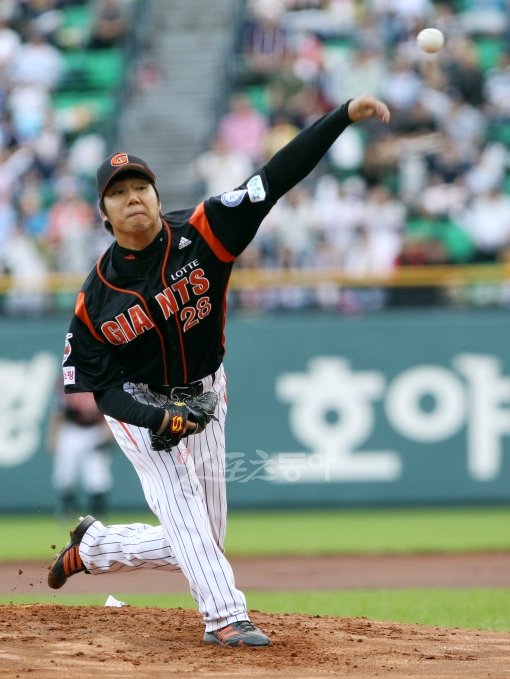 롯데 장원준이 18일 서울 잠실야구장에서 열린 프로야구 롯데 자이언츠와 두산 베어스의 경기에서 선발로 등판해 역투하고 있다.