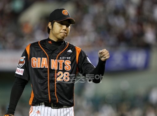18일 서울 잠실야구장에서 열린 프로야구 롯데 자이언츠와 두산 베어스의 경기에서 6회말 두산 공격, 2사 만루 상황에서 롯데 선발 투수 장원준이 실점을 허용하지 않고 공수교대하며 포수 강민호와 주먹을 부딪치고 있다.