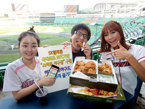 스마트폰을 이용해 스포츠와 엔터테인먼트를 보다 편리하게 즐길 수 있는 서비스가 본격화 되고 있다. SK텔레콤이 와이번스 홈구장 인천문학구장에 적용한 고객편의 스마트폰 서비스 ‘NFC & JOY’. 사진제공|SK텔레콤