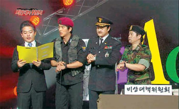 KBS2 개그콘서트 ‘비상대책위원회’. 테러리스트가 폭탄을 터뜨리겠다고 협박한 시간이 1분 남았다. 비상대책위원들이 시계를 보며채근하지만 대통령은 범인에 대한 담화를 읽느라 바쁘다. 듣다 못한 범인은 차라리 자수를 택한다. KBS TV 화면 촬영