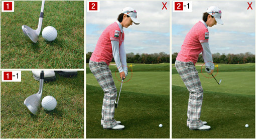 1, 1-1. 클럽 헤드를 지면에 내려놓은 상태에서 뒤쪽(힐) 부분을 살짝 들어 앞쪽(토우) 부분만 지면에 닿도록 셋업한다. 공의 위치는 페이스 중앙 보다 살짝 앞에 위치시킨다.