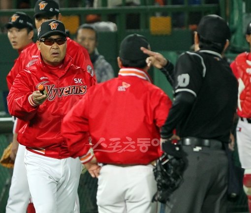 SK가 롯데에 설욕하며 하루만에 2위로 복귀했다. SK 이만수 감독대행이 21일 사직 롯데전 8회초 박진만의 쐐기 2타점 2루타로 6-2로 달아난 직후 관중석에서 날아든 음료수 병을 들고 나광남 주심에게로 다가가 항의하고 있다. 전날 4-5로 패했던 SK는 이날도 홈팀 롯데의 기세에 눌려 초반 0-2로 끌려갔으나 6회 안치용의 1타점 좌전적시타에 이어 대타 최동수의 2타점 좌중간적시타로 단숨에 전세를 뒤엎고, 3회부터 투입한 필승 불펜 정대현∼이재영∼정우람∼엄정욱의 6.2이닝 무실점 계투를 앞세워 승리를 굳게 지켰다.SK, 롯데에 설욕 “멍군”…2위 재탈환