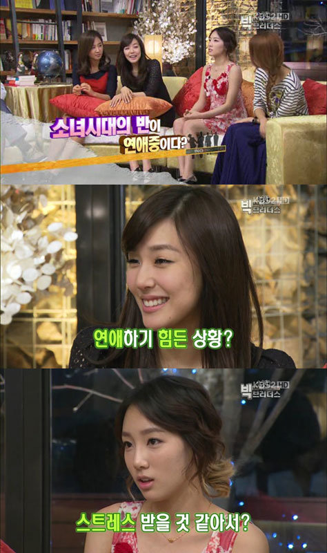 티파니는 “연애하고 싶어도 상황이 안 된다”라고 해명했다. 이어 태연은 “본인이 스트레스 받을 걸 알기 때문에 그런 것 같다”고 덧붙였다.