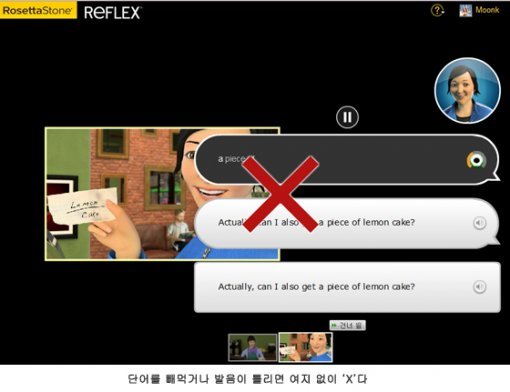 자만심이든 자신감이든 스킬 단계를 완료하면 리허설 단계로 진입한다. 여기서는 특정한 상황을 연출하여 간단한 일상 대화를 진행한다. 일종의 역할 놀이인데, 여기서도 정확한 발음을 체크하는 과정이 들어 있다. 약간 더듬거리거나 발음이 부정확하면 ‘X’표가 표시되는데, 명확하게 잡아내지는 못하는 듯했다. 예를 들어, ‘No thank you’의 ‘th’ 발음(번데기 발음)을 ‘노땡큐’로 발음하나 ‘노쌩큐’로 발음하나 맞은 것으로 인정했다.