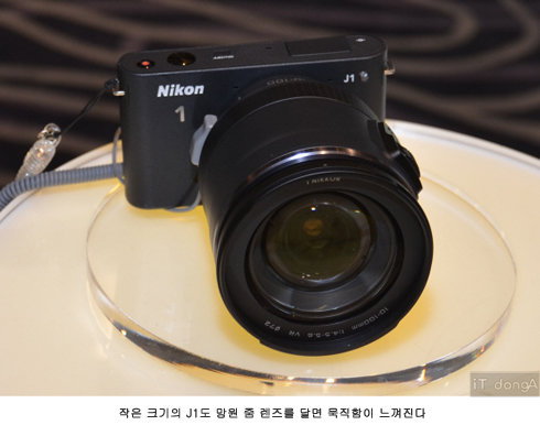 현장에서 직접 살펴본 J1과 V1은 확실히 작고 아담한 외형 디자인이 눈길을 끌었다. 다섯 가지 색상으로 출시한 J1은 니콘이 주장하는 패션 아이템이라고 불러도 무방했다. 다만, J1과 V1 모두 생각보다 무게가 꽤 나간다. 작은 콤팩트 카메라 정도의 크기로 인한 착각 때문인지 몰라도 의외로 묵직한 느낌을 받았다.