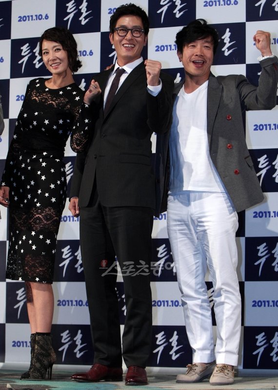 22일 오후 서울 롯데시네마 건대점에서 열린 영화 ‘투혼’의 언론시사회에 참석한 김선아, 김주혁, 박철민(왼쪽부터)이 대박기원 화이팅을 외치며 포즈를 취하고 있다. ‘투혼’은 롯데자이언츠 최고 간판스타였지만 사건사고가 끊이지 않은 탓에 골칫덩이 고물투수가 되어버린 윤도훈(김주혁 분)과 그의 곁을 지키며 각종 사고를 수습해온 오유란(김선아 분)의 개과천선 프로젝트를 담아낸 작품으로 다음달 6일 개봉된다.