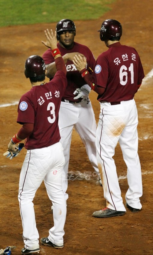 22일 서울 잠실야구장에서 열린 프로야구 넥센 히어로즈와 LG 트윈스의 경기에서 5회초 넥센 공격, 2사 1,3루 넥센 알드리지가 스리런을 날린 후 홈에서 선행주자 김민성과 유한준의 축하를 받고 있다.