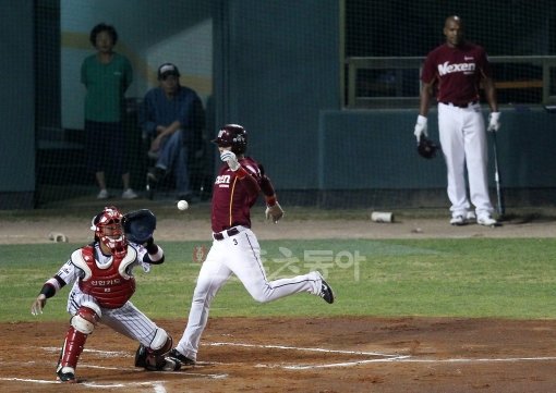 22일 서울 잠실야구장에서 열린 프로야구 넥센 히어로즈와 LG 트윈스의 경기에서 3회초 1사 2루 주자 김민성이 유한준의 적시타로 홈인하고 있다.
