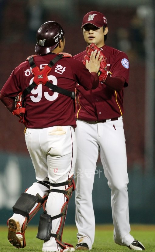 22일 서울 잠실야구장에서 열린 프로야구 넥센 히어로즈와 LG 트윈스의 경기에서 6대 2로 승리한 넥센 손승락과 허도환 배터리가 기쁨을 나누고 있다.