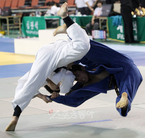 25일 경북 김천실내체육관에서 열린 ‘최민호 올림픽제패기념 2011추계 전국 중·고등학교 유도연맹전’ 단체전 남자중등부 결승경기에서 김태연(청·경민중) 과 강현철(백·보성중)이 경합을 펼치고 있다.
