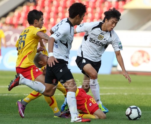 25일 성남 탄천종합운동장에서 열린 프로축구 성남 일화와 전남 드래곤즈의 경기에서 상무 전역을 마치고 첫 복귀한 성남 김정우가 전남 안재준과 볼을 다투다 넘어지고 있다.