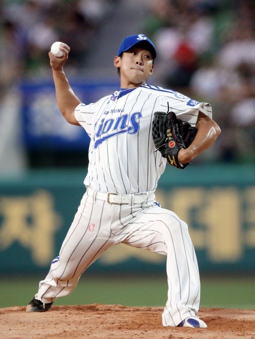 윤성환의 투구폼은 독특하다. 테이크백이 짧고 전체적인 투구폼도 작은 편이다.