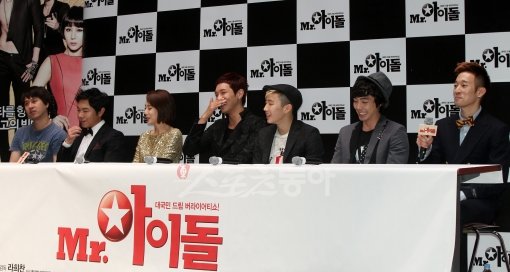 영화 'MR. 아이돌' 제작보고회가 28일 오전 서울 광진구 롯데시네마 건대입구에서 열렸다.생계형 사고뭉치들을 모아 국민 아이돌로 키우기위해 도전하는 내용을 담은 영화 'MR.아이돌'은 오는 10월 개봉된다. 라희찬 감독, 배우 임원희, 박예진, 지현우, 박재범, 장서원, 김랜디(왼쪽부터)가 취재진의 질문에 답변을 하고 있다.