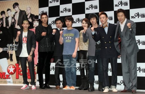 영화 'MR. 아이돌' 제작보고회가 28일 오전 서울 광진구 롯데시네마 건대입구에서 열렸다.생계형 사고뭉치들을 모아 국민 아이돌로 키우기위해 도전하는 내용을 담은 영화 'MR.아이돌'은 오는 10월 개봉된다. 배우 박재범, 지현우, 임원희, 라희찬 감독, 박예진, 장서원, 김랜디, 김수로(왼쪽부터)가 파이팅을 외치고 있다.