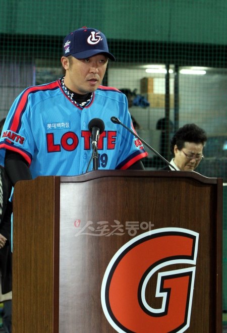 30일 저녁 부산 사직야구장에서 열린 롯데와 두산의 프로야구 경기에 앞서 지난 9월 14일 지병으로 세상을 떠난 故 최동원의 현역 시절 등 번호 11번의 영구결번식이 열리고 있다. 결번식에서 암경완이 추도사를 하고 있다. 사직ㅣ박화용 기자 inphoto@donga.com 트위터 @seven7sola