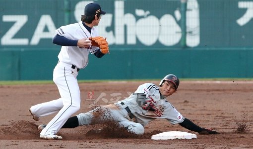 2일 서울 잠실야구장에서 열린 ‘2011 롯데카드 프로야구’ 두산과 LG의 경기에서 2회초 LG 공격 1사 1루 상황에 김태군의 병살타에 1루 주자 오지환이 포스아웃되고 있다.