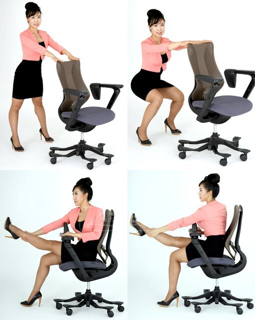 1. 의자 뒤에서 양발을 어깨 넓이로 벌리고 서서 양손으로 등받이를 잡는다.