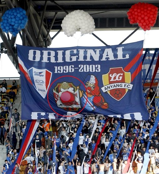 3일 수원월드컵경기장에는 상대를 자극하는 걸개가 걸려 눈길을 끌었다. 본부석 맞은편에 자리잡은 수원 서포터스 그랑블루 소모임 ‘스컬’은 수원과 서울의 전신인 안양의 엠블럼 사이에 ‘클라시코 1996∼2003’이라고 쓰인 걸개를 내걸었다. 서울의 엠블럼(점선안)은 망가뜨렸다. 진정한 라이벌전은 수원-서울이 아니라 수원-안양이라는 의미를 담고 있다. 하지만 이 걸개는 충돌을 우려한 양 구단의 요청으로 곧장 내려졌다.
