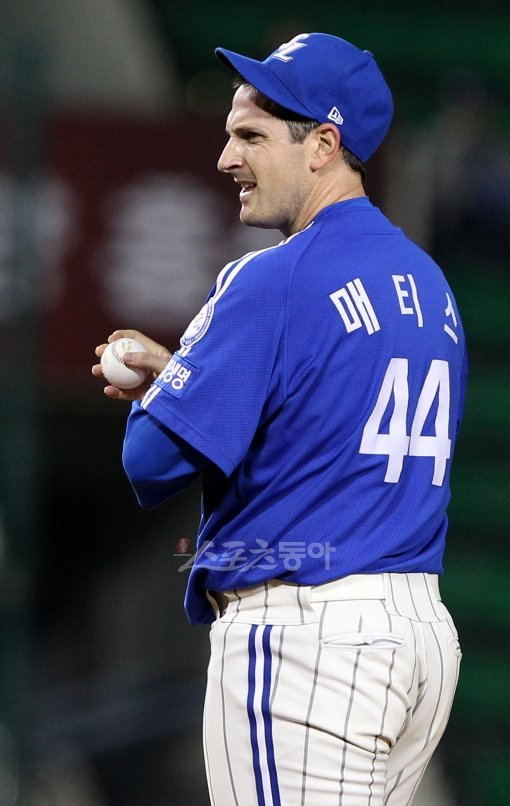 4일 서울 잠실구장에서 열린 프로야구 삼성 라이온즈와 LG 트윈스의 경기에서 1회초 LG 공격, 5회말 1사 2,3루 삼성 매티스가 폭투로 역전을 당한 뒤 아쉬워하고 있다.