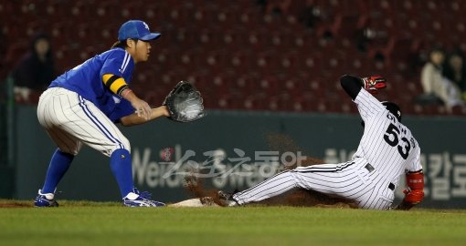 4일 서울 잠실구장에서 열린 프로야구 삼성 라이온즈와 LG 트윈스의 경기에서 1회초 LG 공격, 6회말 LG 공격, 무사 무주자 상황에서 LG 이대형이 우중간 3루타를 친 후 세이프되고 있다.