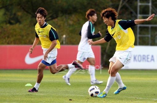 오는 7일 저녁 서울 상암월드컵경기장에서 폴란드와 친선경기를 갖는 축구국가대표팀이 4일 오전 파주NFC에 입소됐다. 박주영과 손홍민이 오후 훈련에서 슛팅 연습을 하고 있다. 파주ㅣ박화용 기자 inphoto@donga.com 트위터 @seven7sola