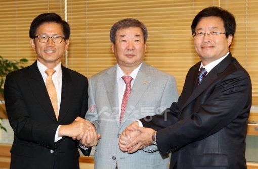10구단 유치를 위해 수원시가 발벗고 나섰다. 김문수 경기도지사(왼쪽)와 염태영 수원시장(오른쪽)이 4일 서울 도곡동 야구회관에서 구본능 한국야구위원회 총재의 손을 맞잡고 있다. 국경원 기자 onecut@donga.com 트위터 @k1isonecut