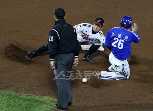 5일 서울 잠실구장에서 열린 프로야구 삼성 라이온즈와 LG 트윈스의 경기에서 4회초 삼성 공격, 2사 1루 주자 조영훈이 강봉규 타석 때 2루 도루에 성공하고 있다.