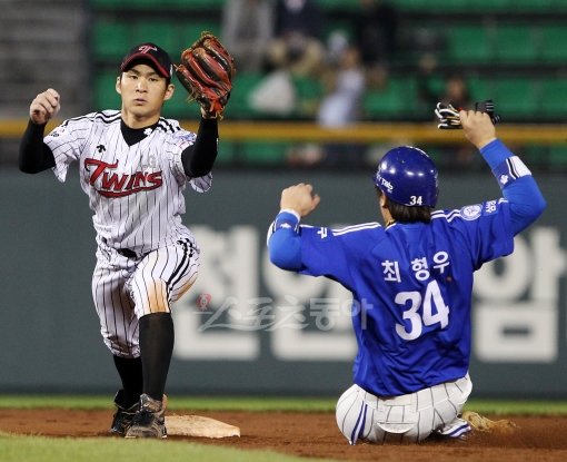 5일 서울 잠실구장에서 열린 프로야구 삼성 라이온즈와 LG 트윈스의 경기에서 9회초 삼성 공격, 무사 1루 주자 최형우가 조영훈 타석 때 포스아웃되고 있다.