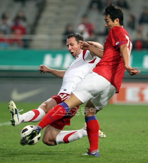 7일 서울월드컵경기장에서 열린 축구국가대표팀 대 폴란드 친선경기에서 축구대표팀 이동국이 폴란드 수비수를 앞에 두고 강력한 왼발 슛팅을 날리고 있다.