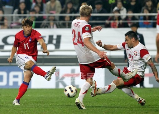 7일 서울월드컵경기장에서 열린 축구국가대표팀 대 폴란드 친선경기에서 축구대표팀 이근호가 폴란드 수비수 사이로 슛팅을 하고 있다.