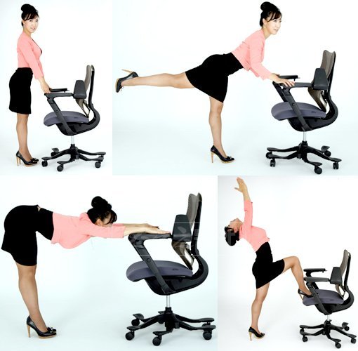 1. 서서 의자의 손잡이를 잡고 숨을 들이마시며 상체를 바로 세우고 호흡을 내쉬며 고개를 오른쪽으로 돌린다. 숨을 들이마시며 원위치, 호흡을 내뱉으며 왼쪽으로 향한다. 각각 5초 정지, 좌우교대 3회 반복.