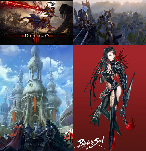 2011년 연말 대회전을 눈앞에 뒀던 게임 대작들이 약속이나 한 듯 출시를 연기했다. 이런저런 사정으로 2012년에 게임 팬들을 만날 기대의 다중접속역할수행게임(MMORPG) 작품들. (사진 맨위 왼쪽부터 시계방향) 디아블로3, 아키에이지, 블레이드앤소울, 레드블러드의 게임 이미지.