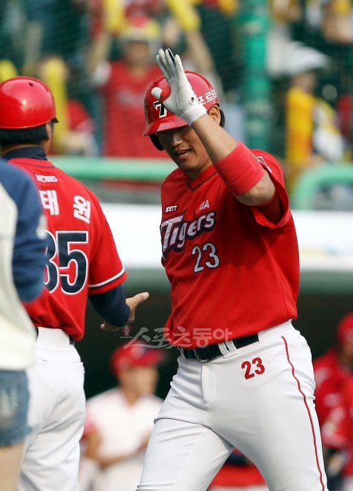 9일 오후 문학야구장에서 열린 2011프로야구 SK와 KIA의 준플레이오프 2차전에서 4회초 KIA 최희섭이 좌월 홈런을 치고 홈을 밟으며 최태원 코치의 축하를 받고 있다.