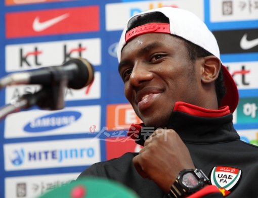 한국전을 앞둔 아랍에미리트연합(UAE)의 공격수 아흐메드 칼릴이 10일 수원월드컵경기장에서 훈련에 앞서 기자회견을 갖고 있다.