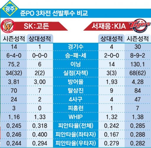 ▲ 이 해설위원=고든은 시즌 막판 공에 힘이 떨어지는 모습을 보였고, 서재응은 SK전 데이터가 좋았지만 압도할 수 있는 스타일은 아니다. 양 팀 벤치의 불펜투입 시기가 1·2차전보다 더 빨라질 수 있고, 그래서 중반 이후 1·2점차 팽팽한 승부가 또 한번 연출될 가능성이 커 보인다. 1∼2점 싸움을 하는 불펜야구가 된다면 아무래도 SK가 유리할 수 있다고 본다. SK 불펜은 대부분 이전 두 게임에 연속 등판해 힘든 상황이지만, SK 투수들은 이런 상황을 헤쳐나갈 수 있는 노하우를 갖고 있다. 불펜에선 여전히 SK가 강하다. 반대로 보면 KIA가 상대 불펜을 깨고 가져가는 1승이 된다면 그 게임은 1승 이상의 가치를 갖게 된다. KIA는 불펜에서 한기주의 빈 자리를 유동훈이나 김진우, 심동섭이 어떻게 메워주느냐가 중요하다.