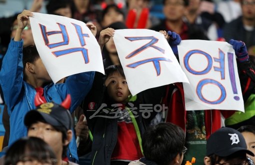 11일 오후 경기도 수원월드컵경기장에서 2014 FIFA 브라질월드컵 3차 예선 경기인 대한민국 대 UAE과 열렸다. 어린이팬들이 박주영 이름이 적힌 종이를 들고 응원을 하고 있다.