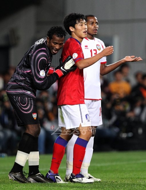 10일 수원월드컵경기장에서 열린 2014년 브라질 월드컵 아시아지역 3차 예선전 한국과 아랍에미리트연합(UAE)와의 경기에서 한국 서정진이 상대 문전에서 자리 싸움을 하자 심판에게 주의를 받고 있다.