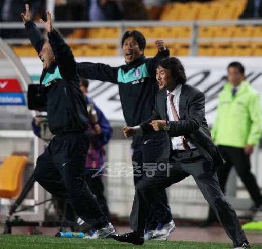 후반전 대한민국 박주영이 선제골을 넣자 조광래 감독이 환호하고 있다.